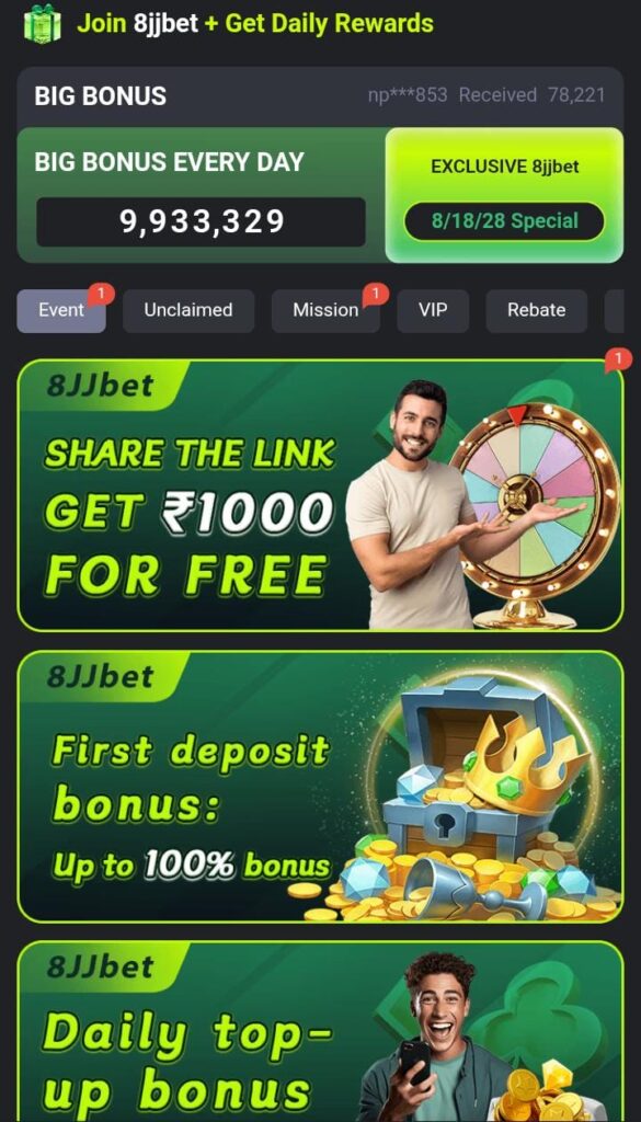 The bonus of free spins in the 8jjBet game is one of the largest. New users are routinely given welcome bonuses and existing players may receive, Daily login rewards, Event bonuses, Referral commissions, These bonuses are used to ensure players get to play more and at reduced risk.